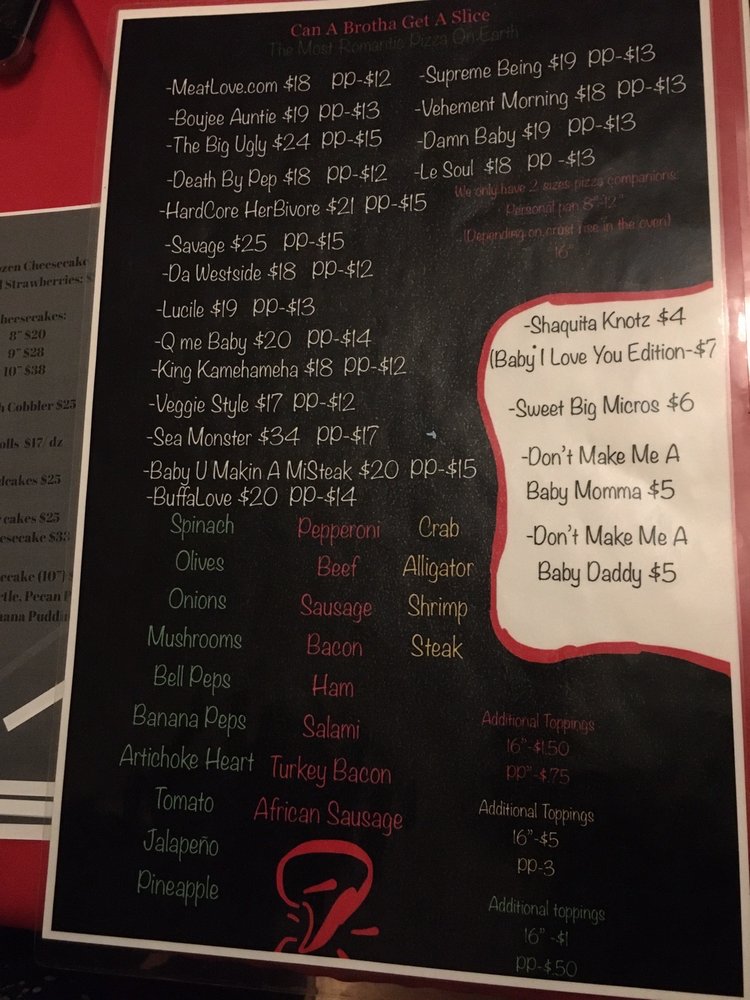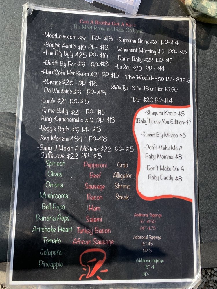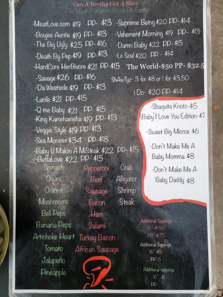 "Can A Brotha Get A Slice" is a pizza joint in Montgomery, AL, known for its eclectic atmosphere and mouth-watering pizzas. With toppings ranging from classic pepperoni to unique combinations like fried chicken and white sauce, this spot offers a slice for everyone. Customers rave about the delicious pizzas, friendly staff, and neighborhood vibe that makes you feel like family. The crust is stuffed, the portions generous, and the menu includes vegetarian and vegan options. Whether you're a meat lover or a veggie fan, "Can A Brotha Get A Slice" is sure to satisfy your pizza cravings. Don't miss out on trying their signature pizzas, like the MeatLove Com and Boujee Auntie. Visit this spot for a true taste of Montgomery's culinary scene.